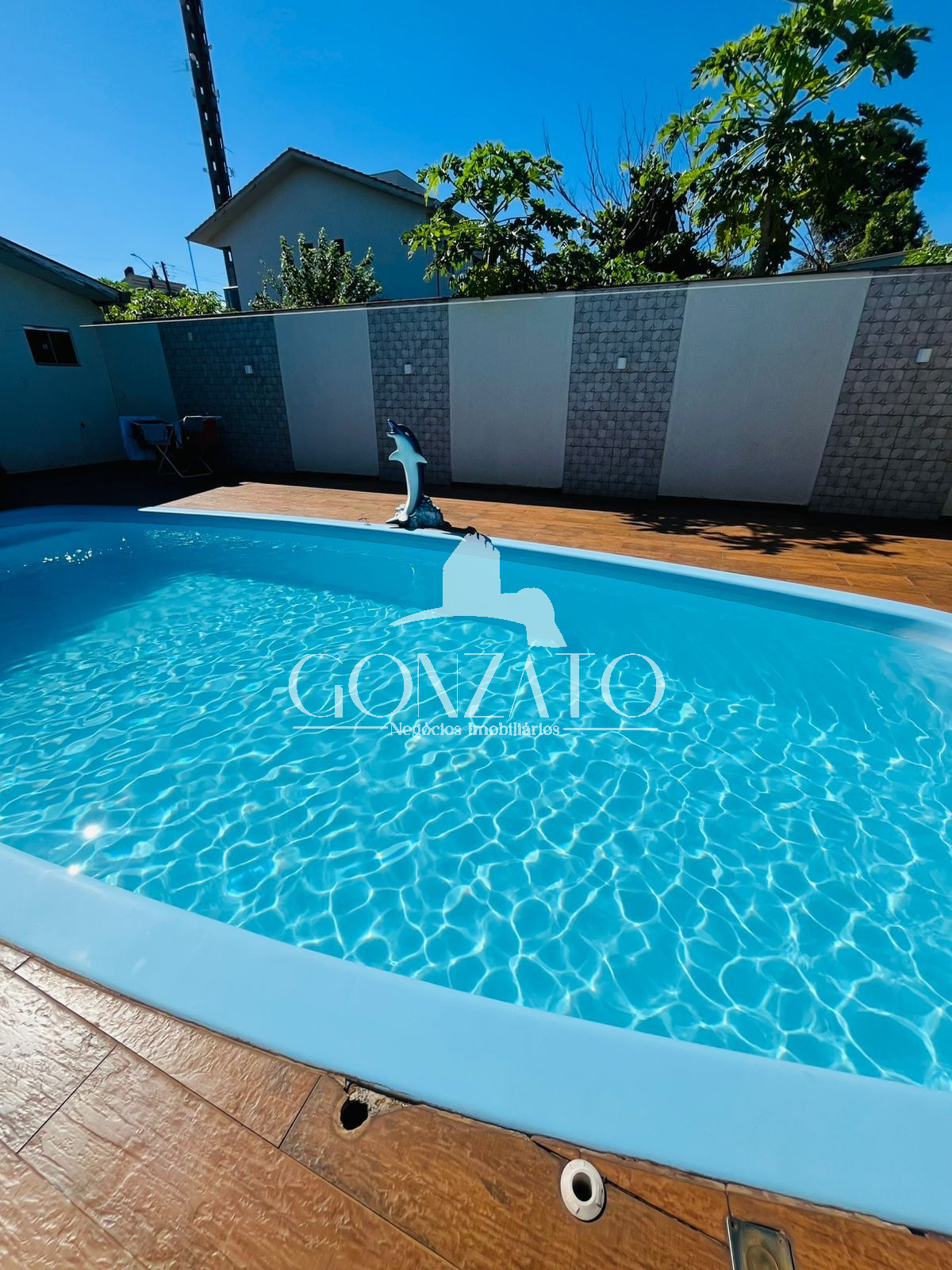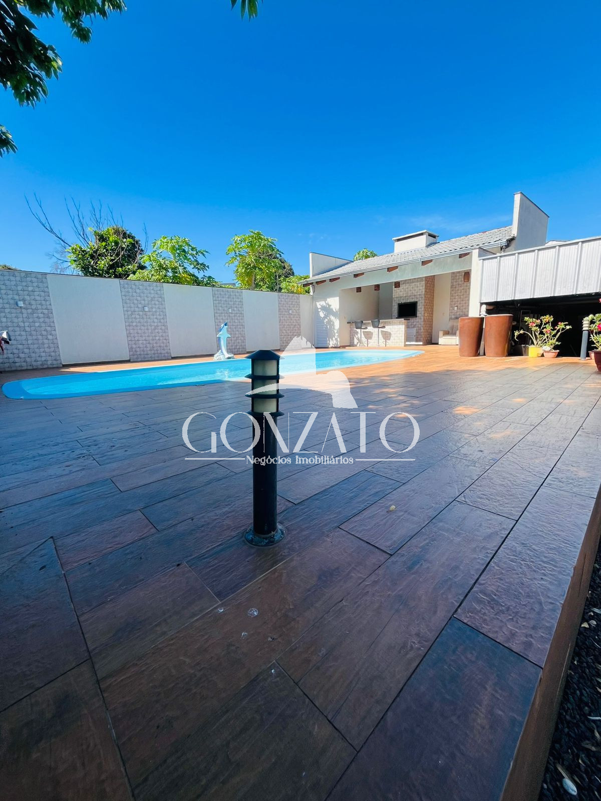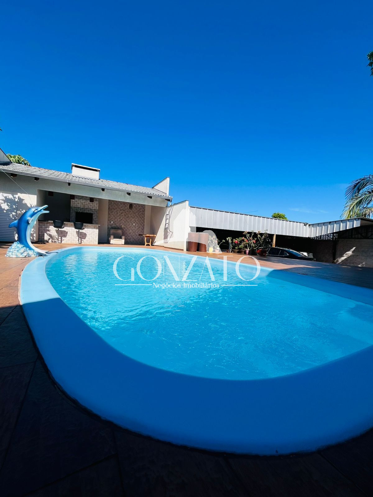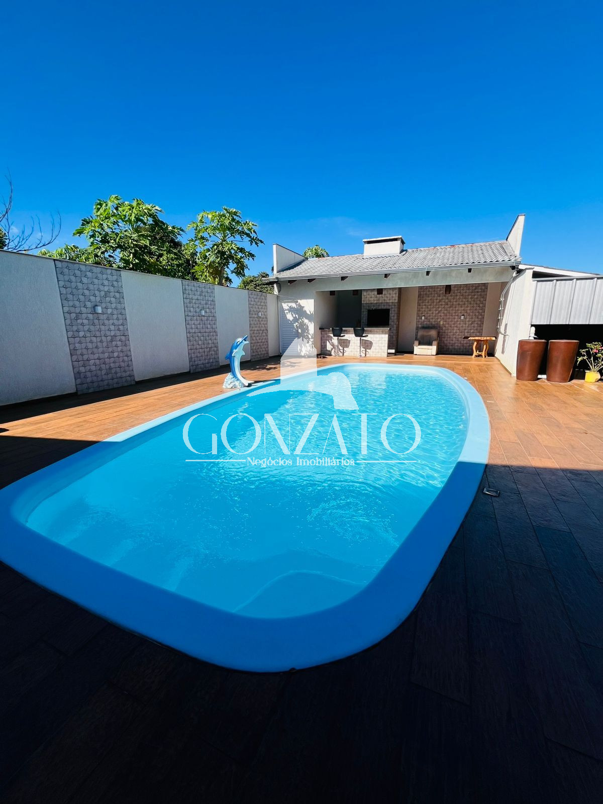 Área da piscina com cascata, piscina de fibra, piso revestido com material próprio à está área, área Gourmet com depósito ao lado.